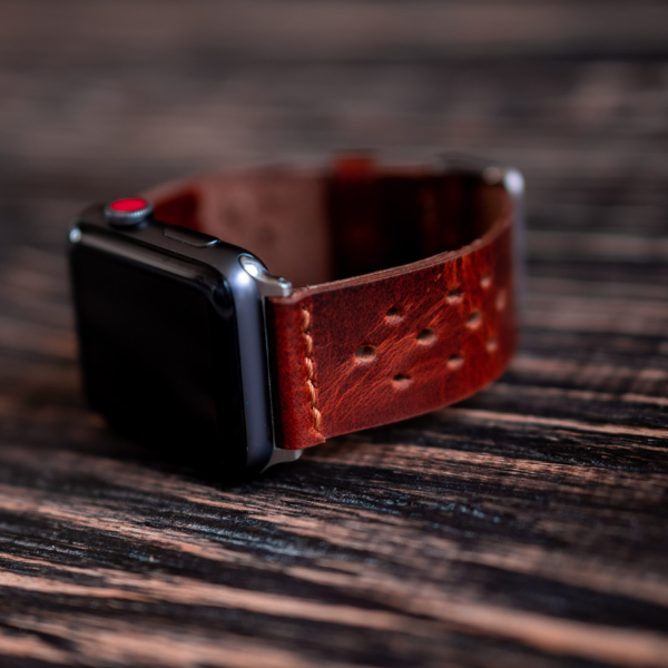 Only Leather strap.\nWatch not included\nHand Stitched.\nTop quality Hardware.\nDurable magnetic connectors.\nHand punched pattern.\nModern minimalist design.\nRugged unlined strap.\nSuper durable quality.\nSuitable for series 3,4,5, 6 & SE.\nVegetable Tanned Leather.\nEasy to install & remove.\nA beautiful and minimal band that looks better as it ages and gains patina. Hand cut, punched and stitched using the finest vegetable tanned leather. Your Apple watch deserves a band that both looks and feels great.\nSuper sleek design, simple and minimalist design with artisan punches make this strap stand out.\nMaterial\n4 Oz (1.6 mm) thick genuine leather.\nApple Watch connectors.\nMetal watch buckle.\nWaxed nylon thread.\nSize\n38 mm / 40 mm – 15 cm x 2.5 cm\n42 mm / 44 mm – 16 cm x 3 cm\n Disclaimer -\nWatch not included. Offering & dimensions are only for the leather strap.\nThis product can be exchanged for any other product of same or higher value but will not be eligible for a refund.\nPlease do not opt for more than 3 alphabets for personalisation on a watch strap due to limited surface area on the product for embossing.\nCall/ Whatsapp: +91 90412 20044\nEmail: contact@beastcraft.in