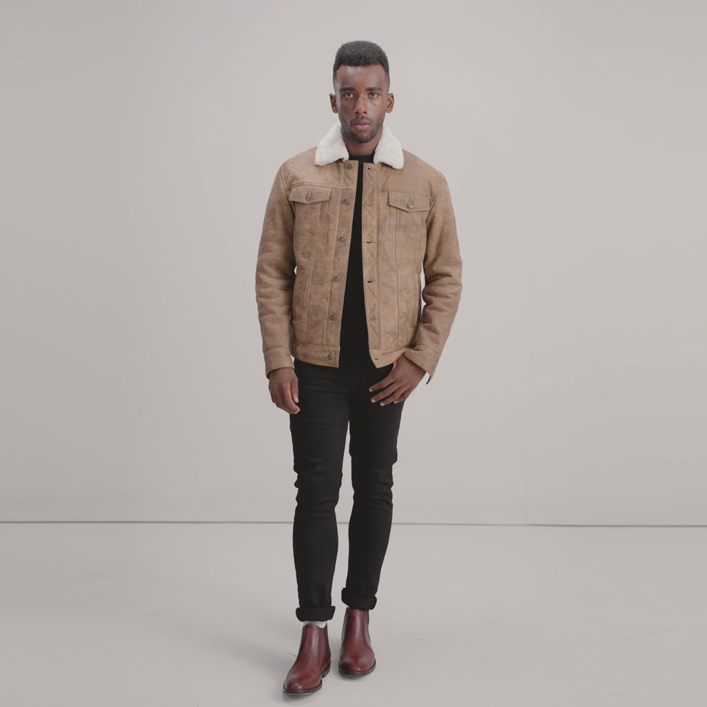 Our Dallis Leather Shearling Trucker Jacket is made from real sheepskin leather, finished with aniline for a luxurious and durable finish. The weight of the jacket is a comfortable 0.5 kg, making it easy for all-day wear.