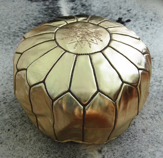 Reflective gold Hand made Moroccan leather pouf .These wonderful genuine leather poufs are handmade by skillful artisans in the Marrakech souk market and they are made of great quality genuine leather.A Moroccan staple that creates a low seating option that makes for a warm and cozy atmosphere, This Moroccan pouf also adds a specail touch to any room. They have a zipper throughout the bottom so you can easily fill the poufs with polyester material you would usually use to stuff pillows.