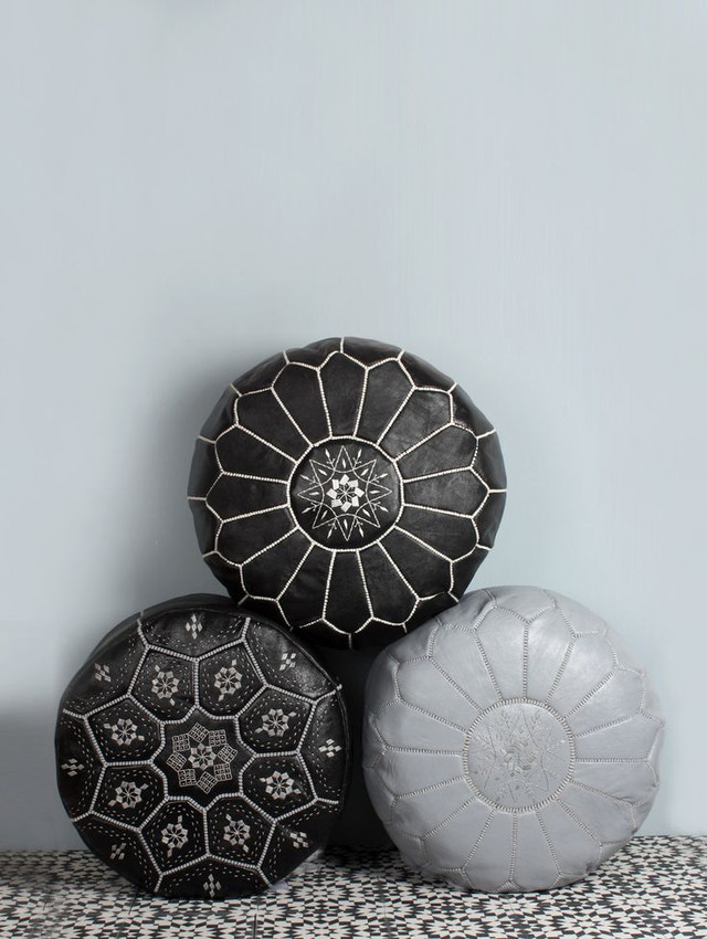 Black flower Embroidery Hand made Moroccan leather pouf .These wonderful genuine leather poufs are handmade by skillful artisans in the Marrakech souk market and they are made of great quality genuine leather.A Moroccan staple that creates a low seating option that makes for a warm and cozy atmosphere, This Moroccan pouf also adds a specail touch to any room. They have a zipper throughout the bottom so you can easily fill the poufs with polyester material you would usually use to stuff pillows.