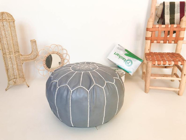 Gray Embroidered Hand made Moroccan leather pouf .These wonderful genuine leather poufs are handmade by skillful artisans in the Marrakech souk market and they are made of great quality genuine leather.A Moroccan staple that creates a low seating option that makes for a warm and cozy atmosphere, This Moroccan pouf also adds a specail touch to any room. They have a zipper throughout the bottom so you can easily fill the poufs with polyester material you would usually use to stuff pillows.