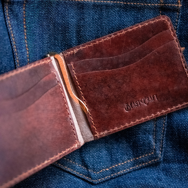 Classic minimal design.\nEasy currency pullout\nBrass clipper.\nID slot on the back side.\n100% leather, no lining.\nMultiple card slots.\nSlim Profile.\nDurable nylon lock stitching.\nTop Grain Leather.\nA great alternative for a traditional wallet for the minimalism lovers. A beautifully crafted very slim profile money clipper wallet. Our best seller in wallets category.\nMaterials\n5 0z (2mm) thick semi vegetable tanned hand waxed leather.\n100% solid brass clipper.\nSpace\n6 card slots.\n1 open clipper slot for cash\nOne ID slot on the back.\nDimensions \nHeight – 3.2″\nLength – 4.5″\nCall/ Whatsapp: +91 90412 20044\nEmail: contact@beastcraft.in