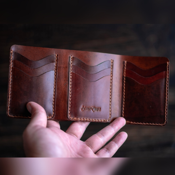Trifold wallet.\nModern Vintage design.\nModern smooth edges.\n100% leather, no lining.\n1 large cash slot.\n9 card slots.\nSeparate ID slot.\nGenuine pull up Leather.\n Our take on a classic trifold wallet. Super spacious yet slim and compact. Easily store multiple cards and currency notes without feeling the bulk.\nOnce you have this wallet it will be a companion for decades to come and get prettier with time and ageing. \nMaterials\n4 0z (1.6 mm) thick genuine hand waxed leather.\nHigh quality Japanese nylon thread.\nSpace\n9 card slots.\n1 large cash slot.\n1 ID Slot\n Dimensions \nFolded\nHeight – 3.25″\nLength – 4″\nWidth – 0.7\nOpen\nHeight – 3.25″\nLength – 9″\nCall/ Whatsapp: +91 90412 20044\nEmail: contact@beastcraft.in