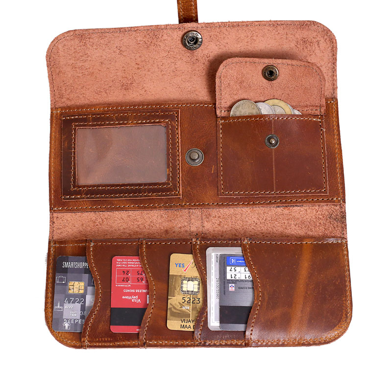– Multiple card slots, cash compartments, and ID window